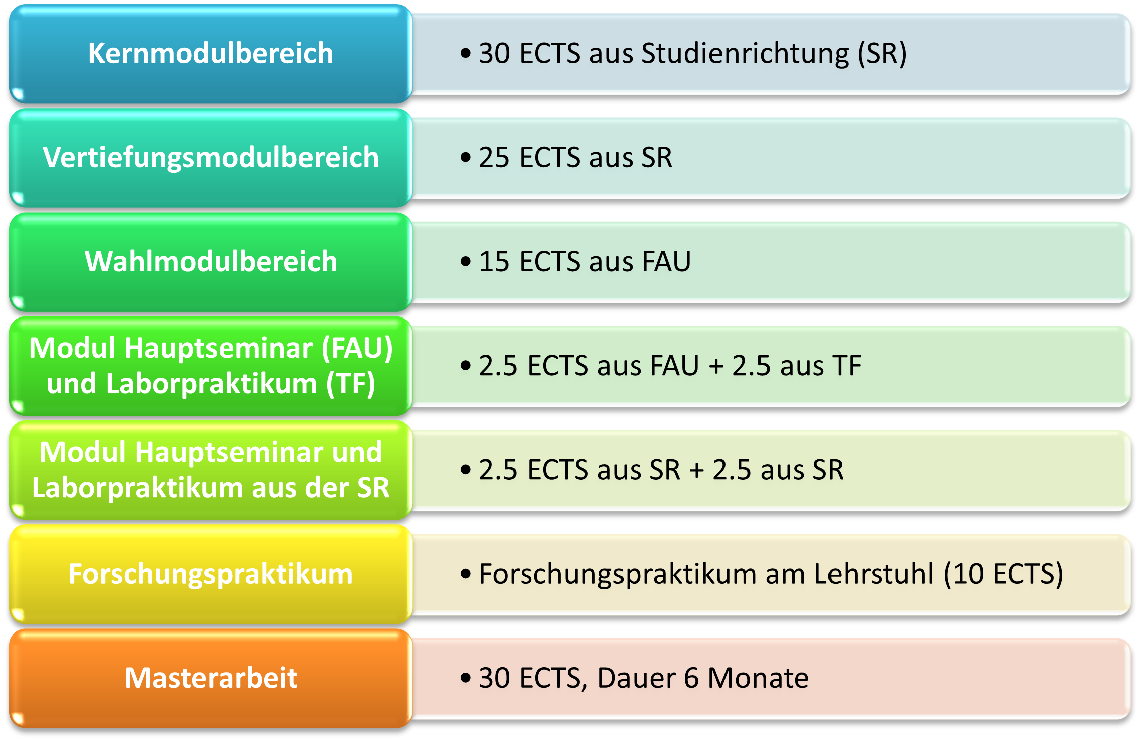 Außerdem dürfen die Studierenden 15 ECTS an Wahlmodulen einbringen. Hierfür steht ihnen fast das gesamte Studienangebot der FAU zur Verfügung. Ein Hauptseminar, das aus dem gesamten Angebot der FAU gewählt werden kann, sowie ein Laborpraktikum, das aus dem gesamten Angebot der Technischen Fakultät gewählt werden kann, runden die Wahlmöglichkeiten ab.